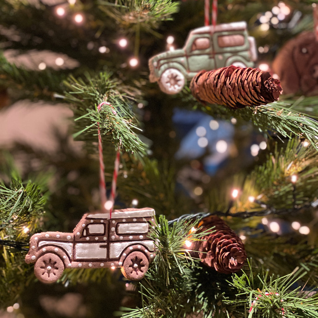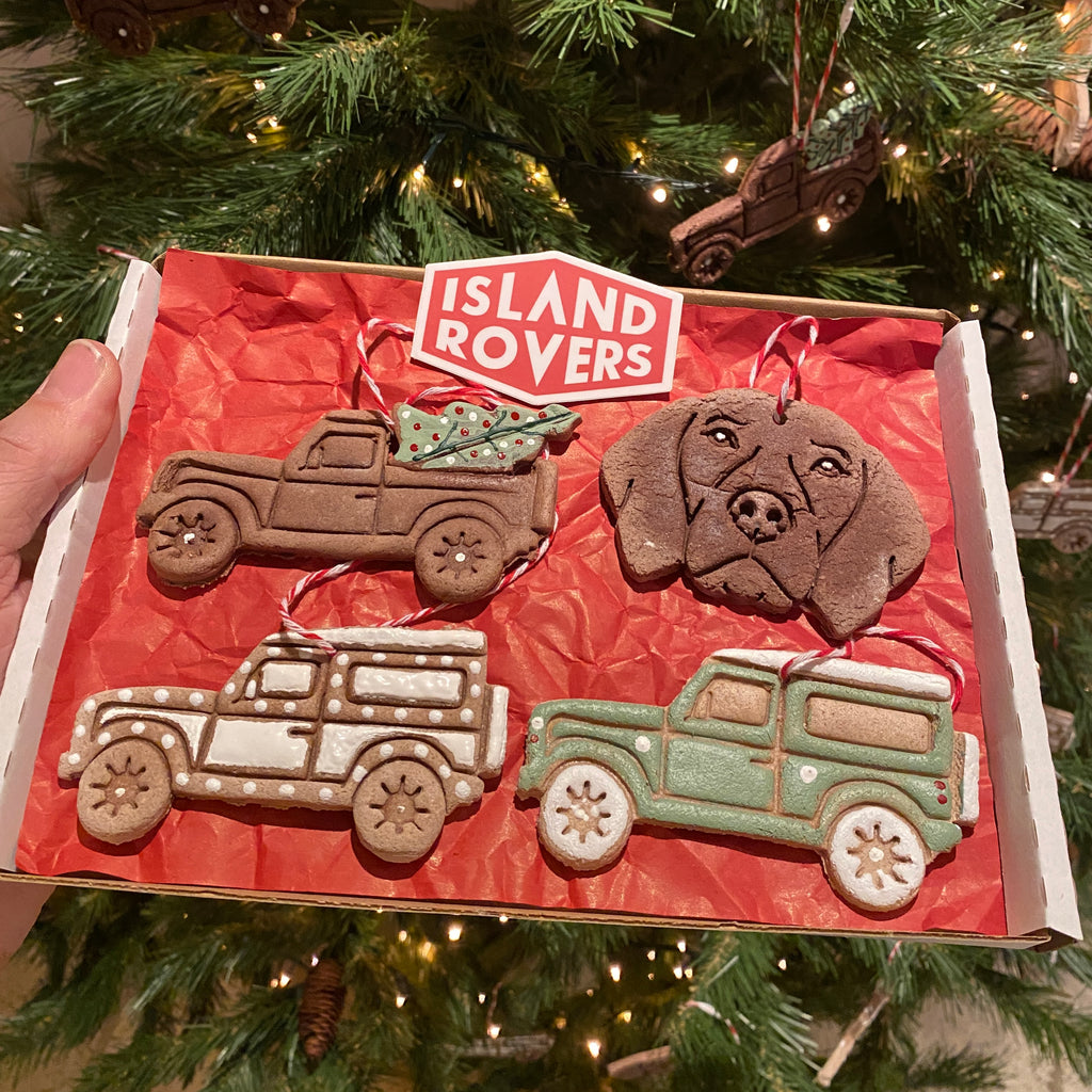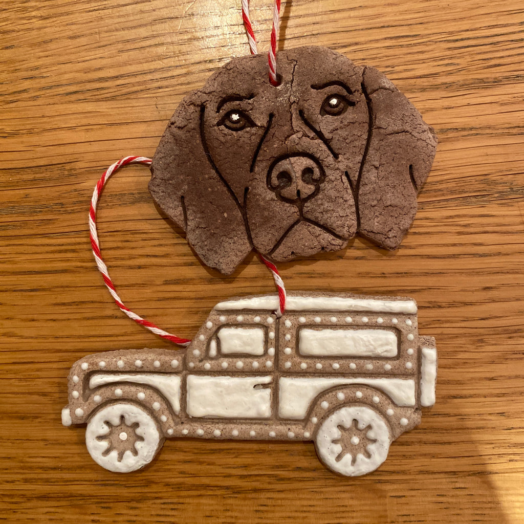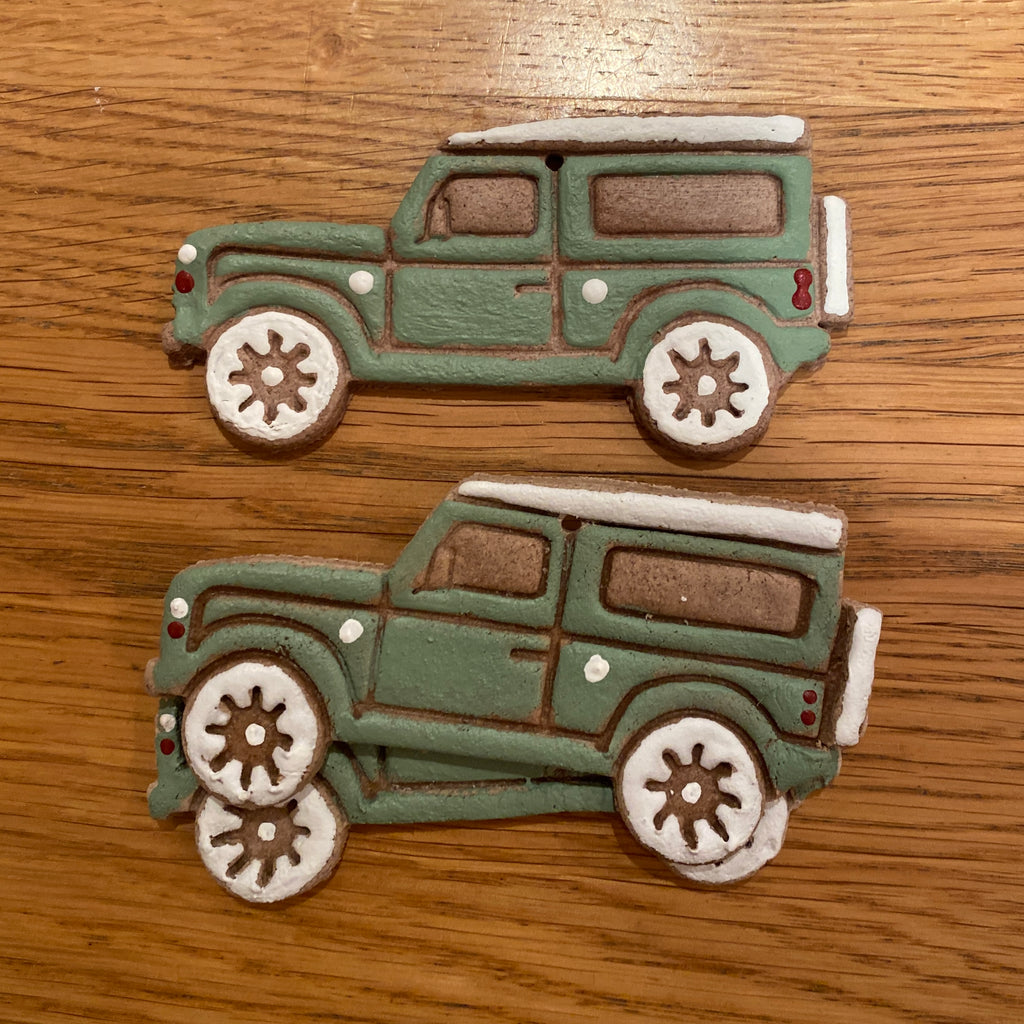 Crusty gingerbread effect salt dough Christmas tree ornaments. Lovingly handmade, so each one is unique, just like a real Land Rover. Colours and finishes may vary ... also just like a real Land Rover!